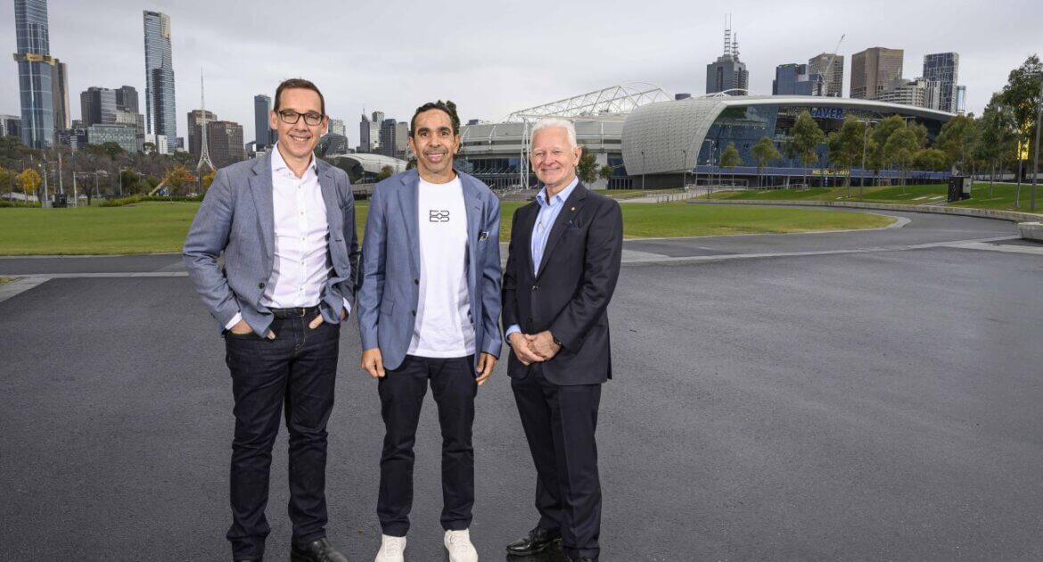 Image: Minister for Tourism, Sport and Major Events Steve Dimopoulos (left), Eddie Betts Foundation founder Eddie Betts (centre), and Melbourne & Olympic Parks Trust Chair Patrick Flannigan (right).
